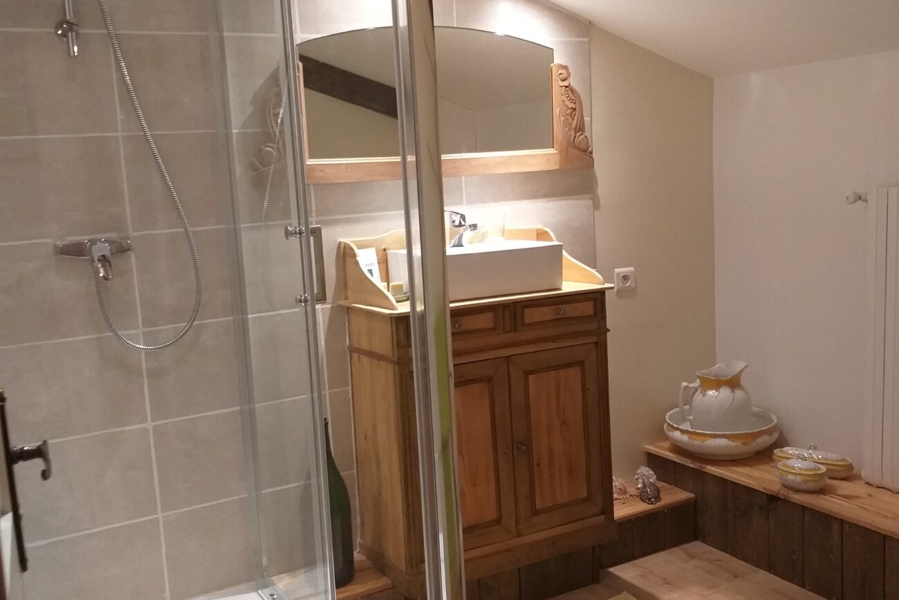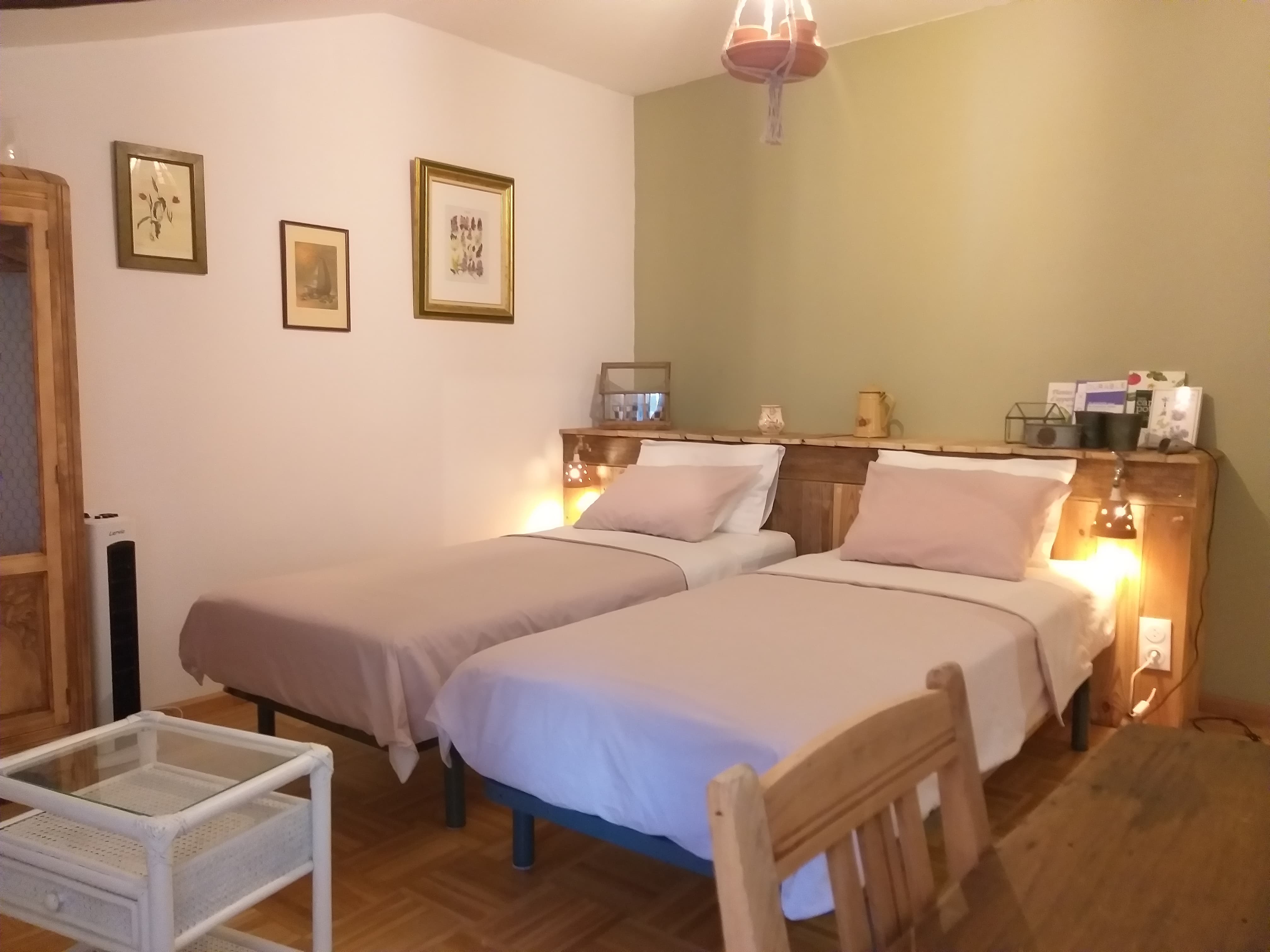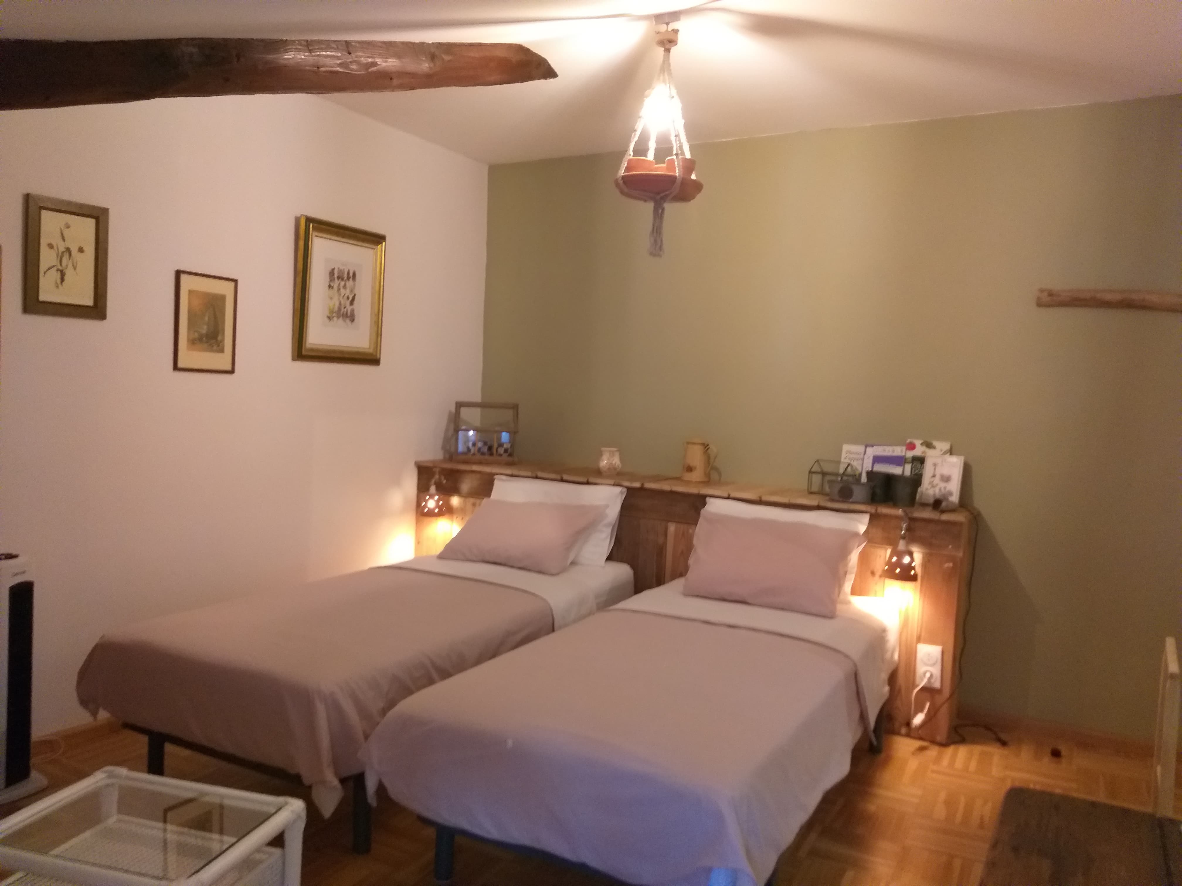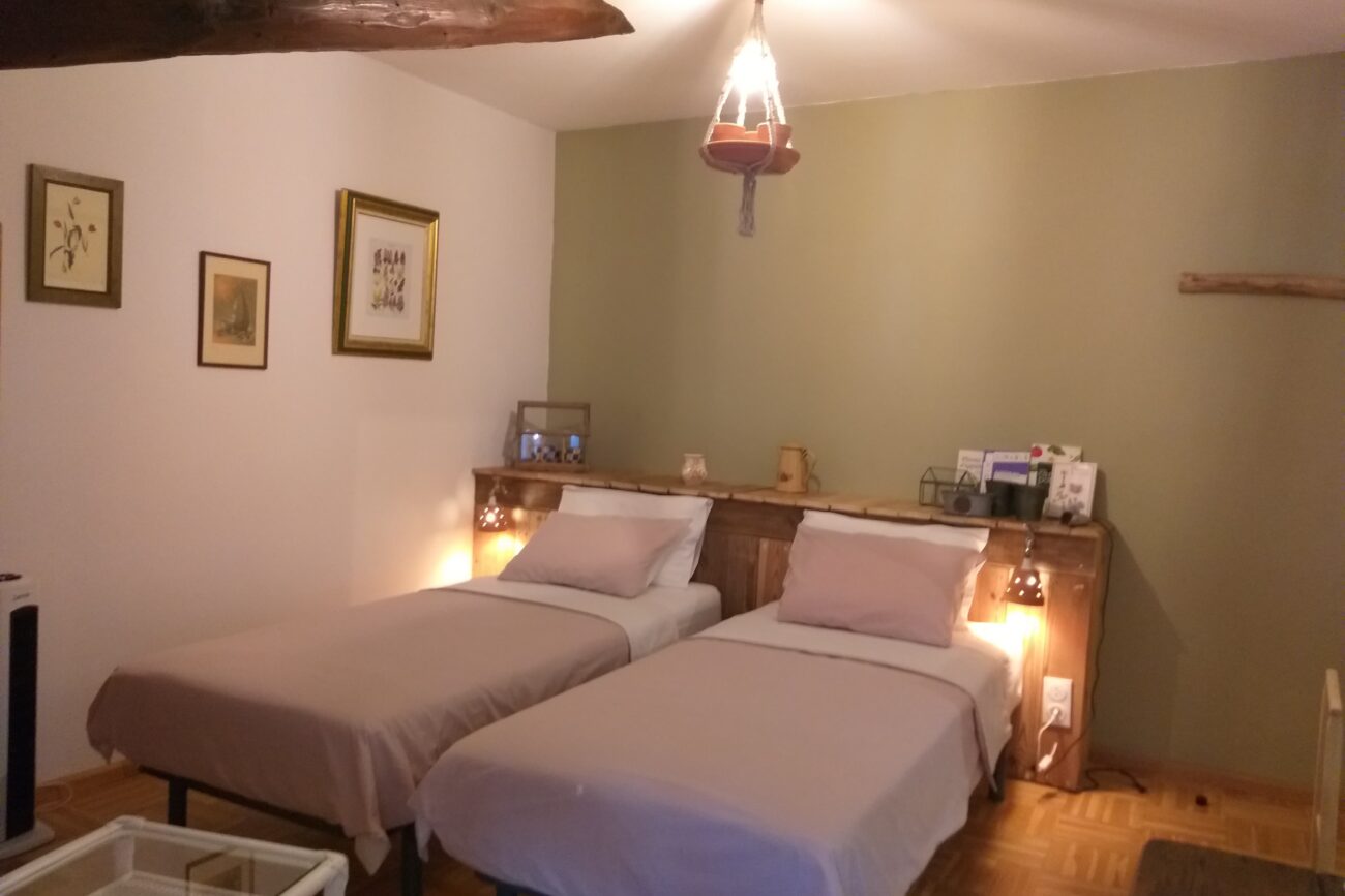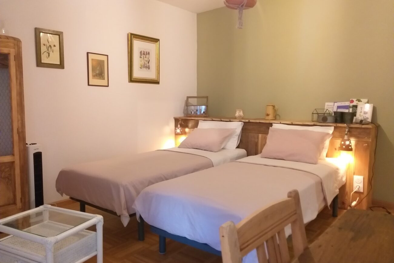 Chambre équipée de 2 lits de 90/200 avec Salle de bain privative (Douche, lavabo et W.C., sèche-cheveux) Plateau d’accueil (Bouilloire électrique, machine à expresso)